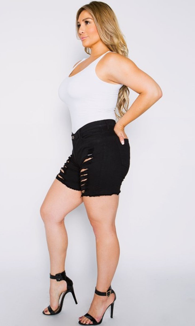 MID RISE, DISTRESSED , FRAYED HEM, STRETCHY