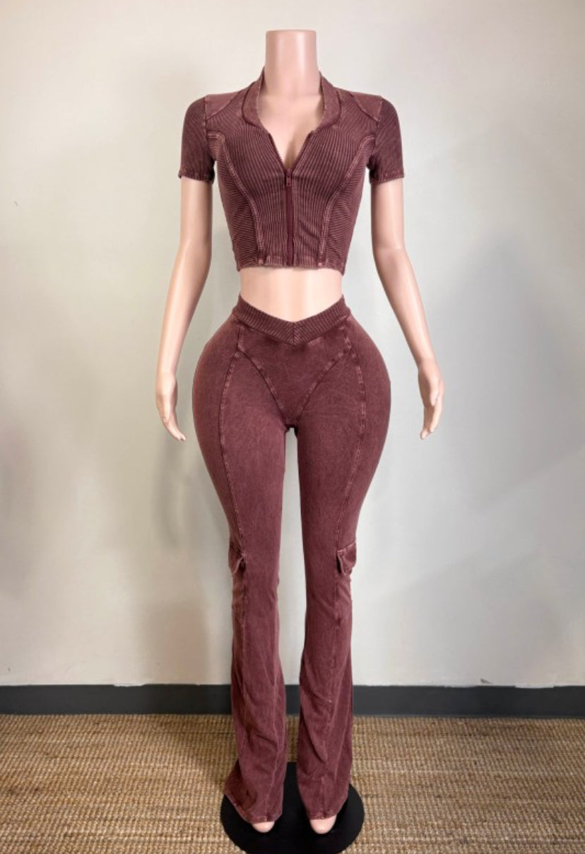 Short sleeve crop zip up top, fitted stretch flare mineral wash 2pc set