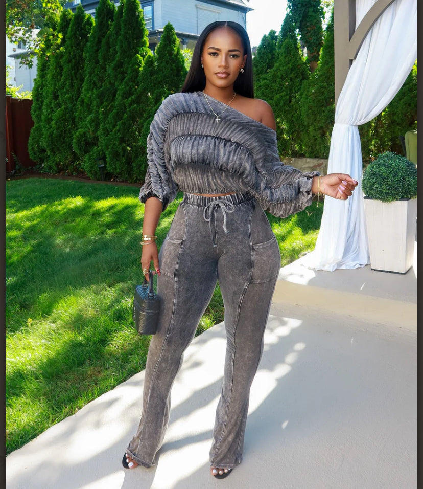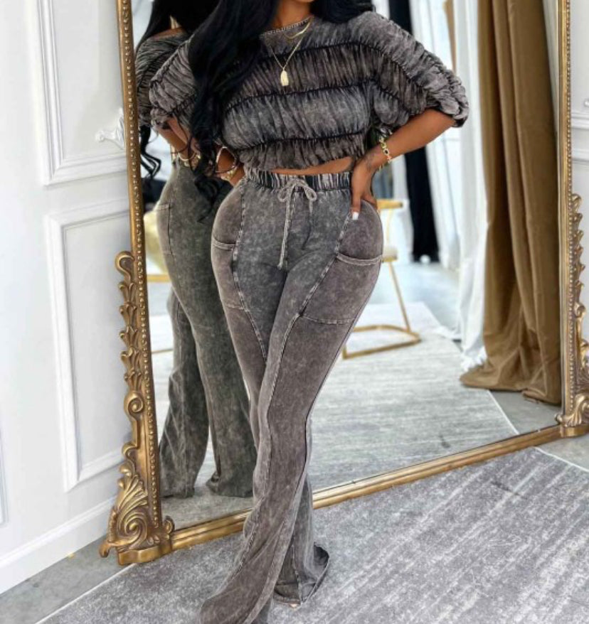 Runched crop top can be worn off the shoulder, flare pants mineral wash set . Tall girl friendly