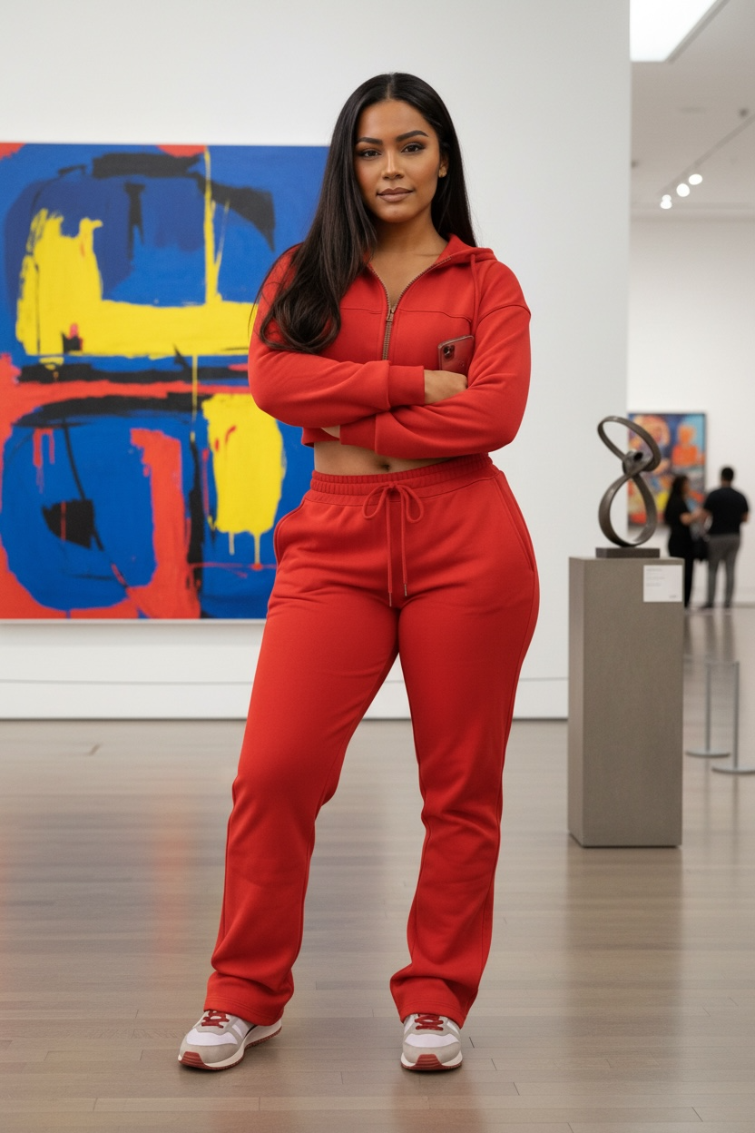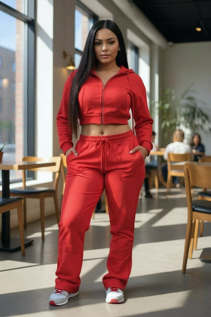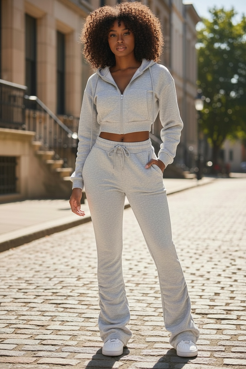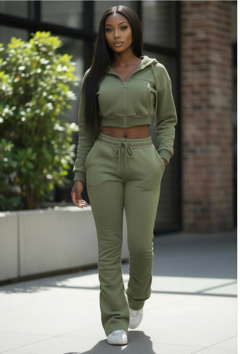 Crop hooded zip up jacket, stacked jogger with pockets, thick material. Some stretch